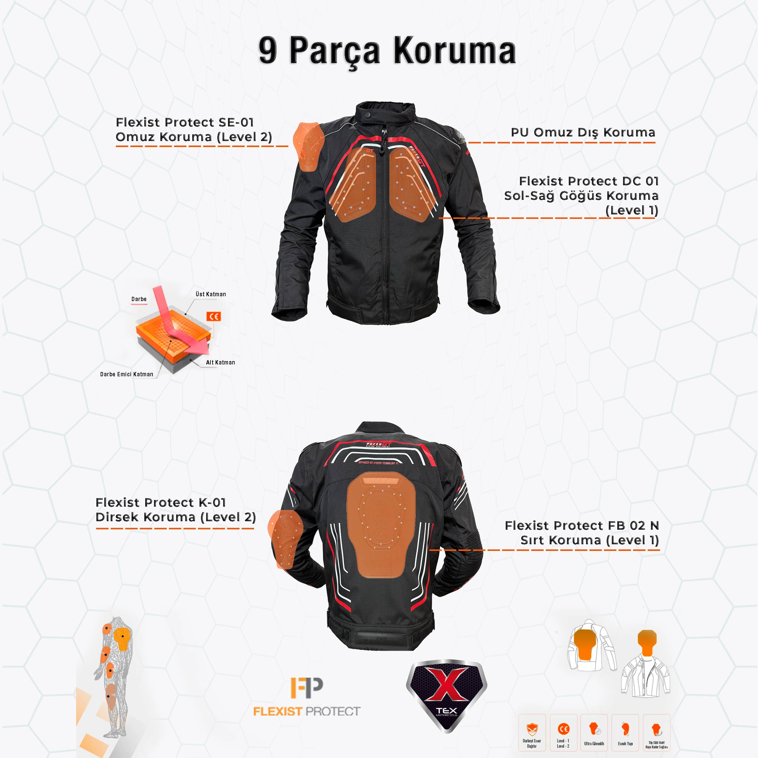 Dayanıklı dış kumaşı, rüzgâr ve hafif yağışlara karşı etkin koruma sağlarken nefes alabilir iç astarı uzun sürüşlerde terlemeyi minimuma indirir. Omuz ve dirseklerde yer alan darbe emici pedler güvenlik seviyesini artırırken ayarlanabilir bel, bilek ve kol tasarımları montun farklı vücut tiplerine tam uyum sağlamasına yardımcı olur. Montun hafif yapısı, sürüş sırasında hareket özgürlüğünü artırarak konforlu bir deneyim sunar.